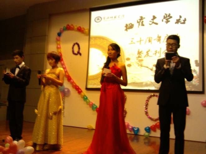 庆典在柔美的歌舞中拉开序幕,胡经理提出“文学是人生的追求,它让你在生活中保持一种浪漫”,并对栖霞文学社三十年来的累累硕果表示肯定,对栖霞文学社未来发展寄予希望。余书记饱含深情地回顾了《栖霞》的历史,“因为坚守,创造栖霞辉煌”,对《栖霞》传承与创新提出了新的要求;夏教授号召栖霞文学社广泛团结爱好文学者,让更多的高年级同学能够参与进来。随后,一首真情流露的《栖霞颂》以及“栖霞,我有话对你说”为主题的纪录片都表达了社员们对《栖霞》的深深爱恋,更是借此向《栖霞》说声生日快乐。“学到该学的,给我们能给的”是《栖霞》社长的一句话,更是《栖霞》每个成员的宗旨。