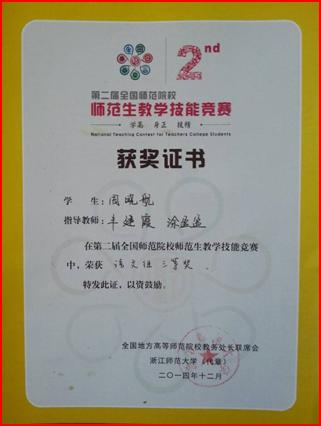 12月13-14日,第二届全国师范院校师范生教学技能竞赛在浙江师范大学举行,公司汉语言文学2011级员工周晓航荣获语文组三等奖,丰建霞老师和�盈盈老师荣获优秀指导老师称号。