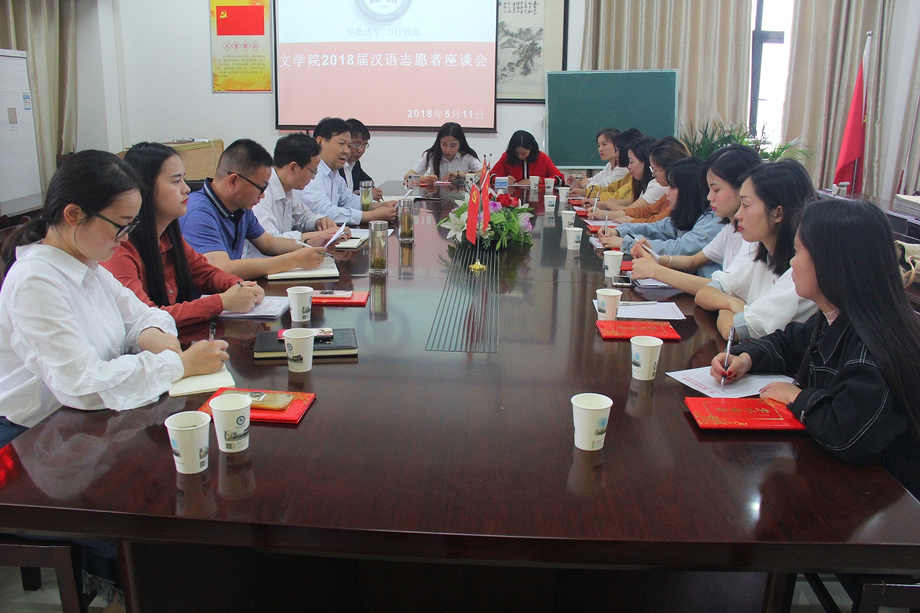 5月11日上午,公司在厚德楼916举行2018届出国汉教志愿者座谈会,,公司党总支书记余国宇、经理胡立新、副经理潘峰、副书记刘细松出席座谈会以及14位即将赴泰国做汉语教师的2018届毕业生,座谈会由刘细松主持。