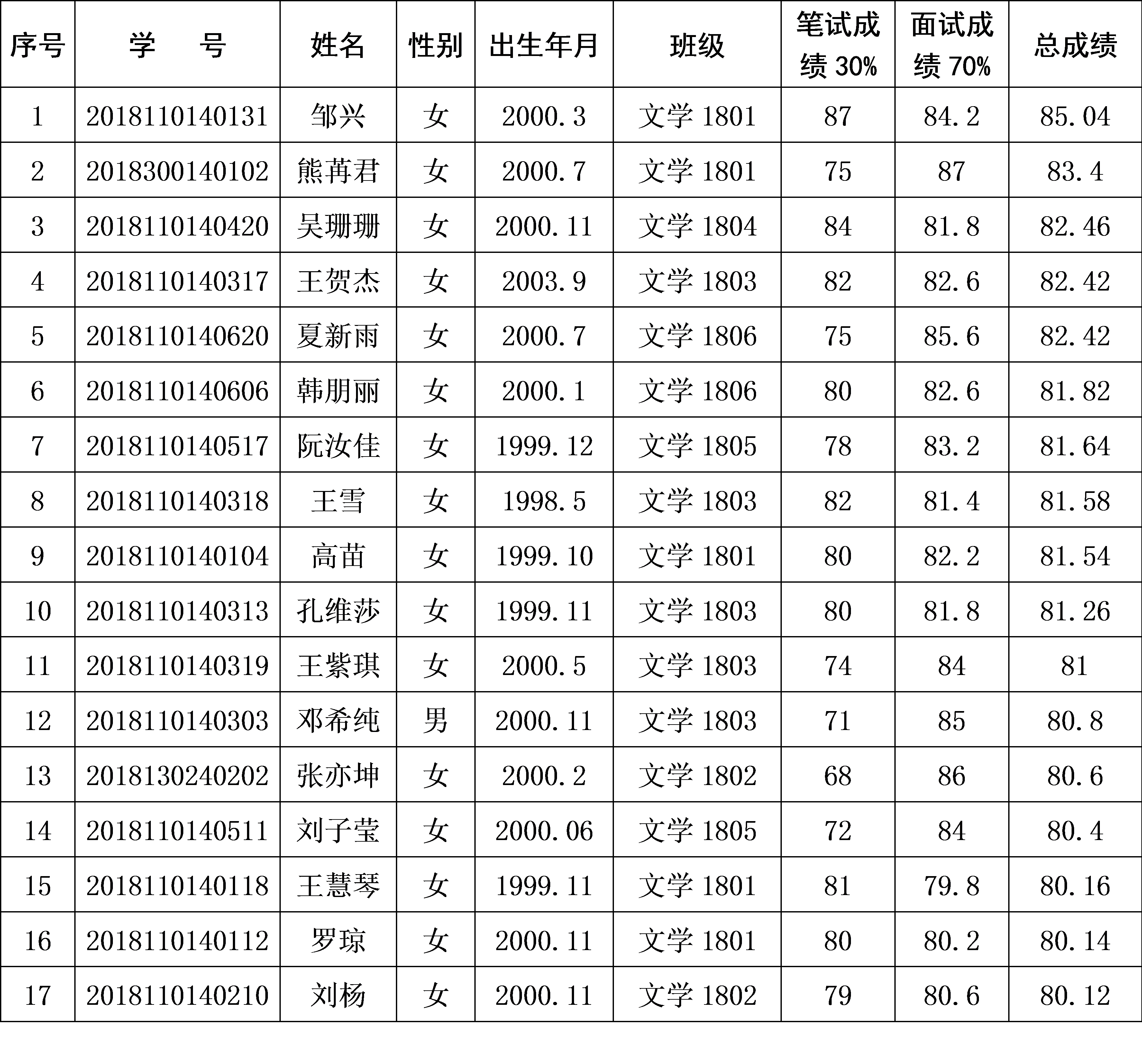 通过前期广泛升入的宣传动员,报名参加公司“东坡国学良师班”的汉语言文学专业2018级员工共有29人。经过笔试、面试等环节,本班拟录取17人,名单现已确定,公示如下: