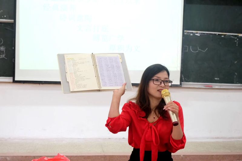 讲座分为三部分。第一部分教师篇,沈燕老师首先展示了黄梅一中2019届高考取得的优异成绩,讲到作为一名优秀语文教师,要在专业上博学多思,孜孜以求。她结合展示的高三同学的语文各种笔记本和进入名校员工对语文的反馈和高考备考中文言文、小说、散文等阅读训练时的教学方法,总结出语文学习中需要经典濡养、诗词熏陶、文言打底、博览广学、厚积为文。她结合自身在大学四年坚持读背诗词和阅读各种书的经历,勉励同学们要博览群书,夯实基础,扎实专业素养。第二部分情怀篇,她指出这里的情怀指爱教书、爱员工,爱讲台、爱舞台,以及爱自己、爱生活。沈老师说作为一名教师,要在员工心里撒下阳光,他们会在寒冷的时候感受到温暖并铭记你。教师这份职业有光明的前途,虽然很苦,但能获得满满成就感和幸福感,并保持年轻的心态。站在三尺讲台上,要热爱这份神圣的工作,用自己的一捧水面对员工一杯水。第三部分初心篇,同学们踊跃提问,向老师请教自己生活和学习问题,沈老师耐心解释,言传身教希望同学们要坚持读书,学会读书。