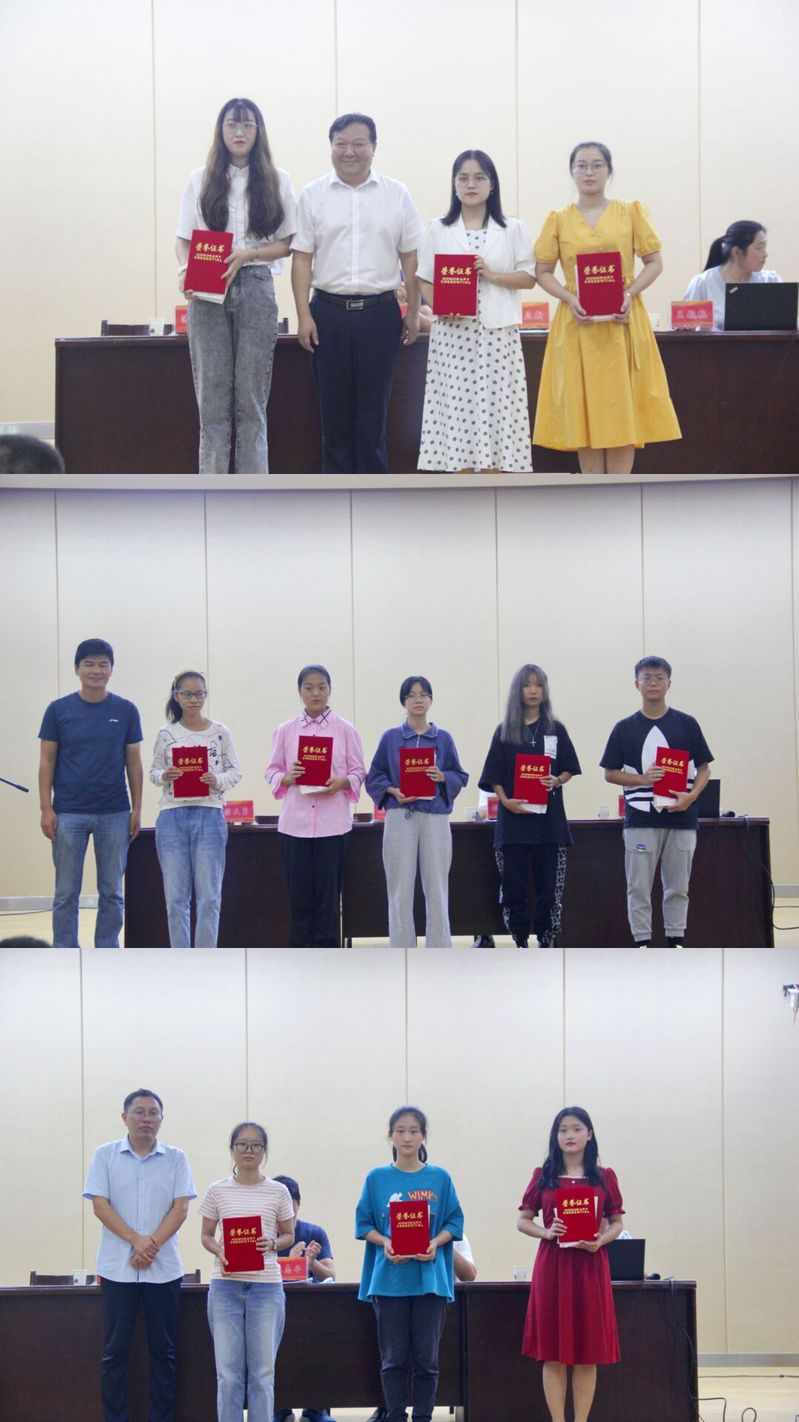 副经理汤天勇宣读研究生第一志愿前三名,湖北省高考总分前五名,外省高考成绩第一名(三位同学并列第一)获奖员工名单,由胡立新书记、陈志平经理、汤天勇副经理分别为获奖同学颁奖并合影留念。