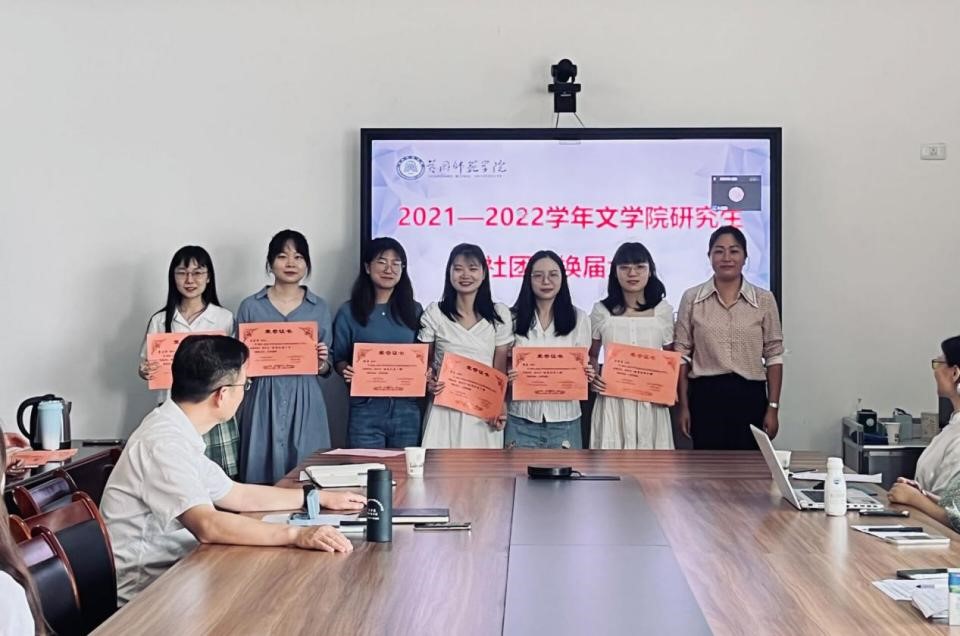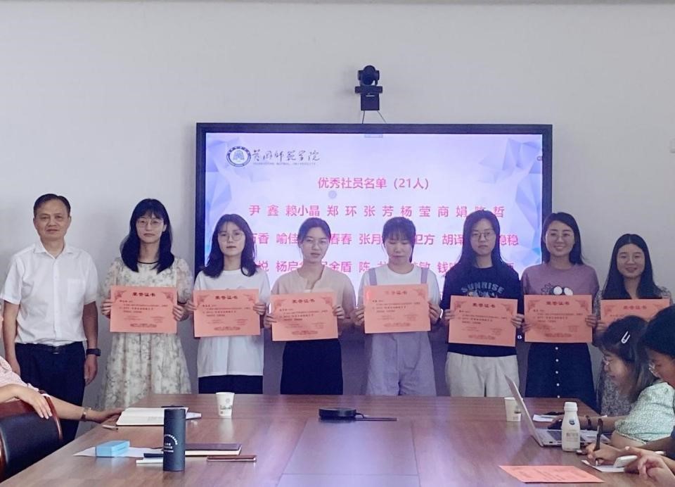 换届大会由五项议程组成:第一项是主持人介绍参会老师;第二项是颁奖,王艳艳老师、方正老师分别为2021-2022学年度优秀社干、社员颁发荣誉证书,并合影留念;第三项是新一届社团干部作就职发言;第四项是参会老师发言,何玉华老师和方正老师分别作社团指导发言,王艳艳老师作总结发言;第五项是全体与会人员合影留念。