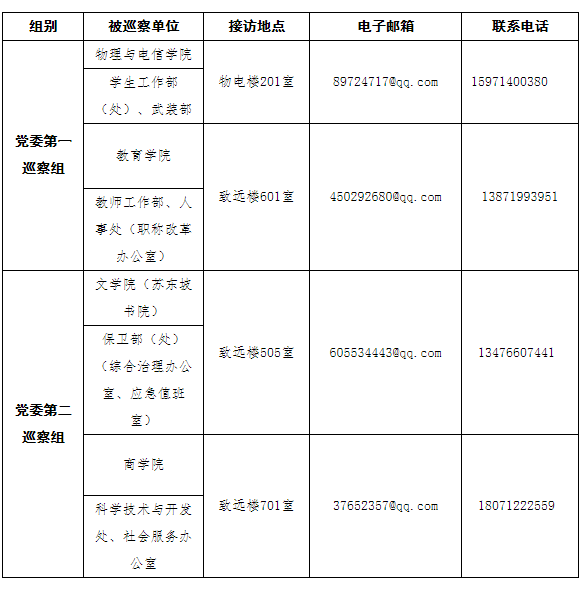 公司党委各巡察组在巡察期间接访时间为工作日上午8:00-12:00,下午14:00-17:30,具体联系方式等如下: