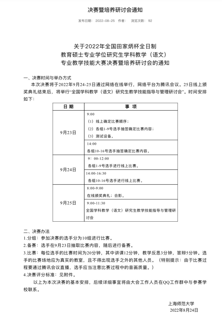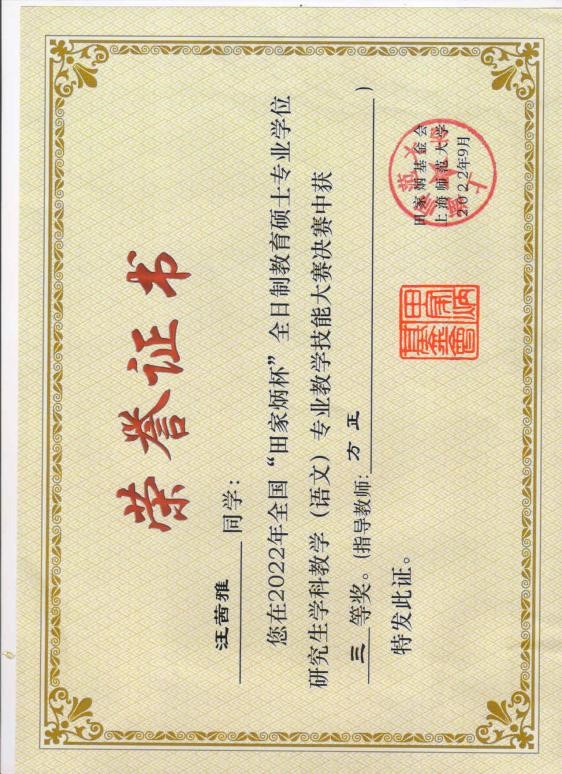 (通讯员 吴婷婷)2022年5月至2022年9月,为期四个月的2022年全国“田家炳杯”全日制教育硕士专业学位研究生学科教学(语文)专业教学技能大赛圆满落幕,公司2020级研究生汪茜雅荣获三等奖。据悉,本次大赛由田家炳基金会和上海师范大学联合主办,是目前国内层次最高、规模最大的教育硕士教学技能竞赛,旨在推动培养院校进一步加强全日制教育硕士专业学位研究生公司产品实践能力的培养,增进培养院校之间的相互交流学习,促进共同发展。