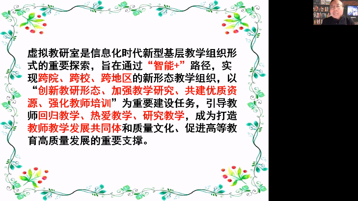 柏教授指出,虚拟教研室是一种新的教育理念的产物,它对当下的教育模式提出了挑战。他依次从三个方面做了重点讲述:第一,虚拟教研室的含义:虚拟教研室是信息化时代新型基层教学组织形式的重要探索,旨在通过“智能+”路径,实现跨区域的新形态教学组织。第二,围绕《教育部关于加快建设高水平本科教育全面提高人才培养能力的意见》《教育部