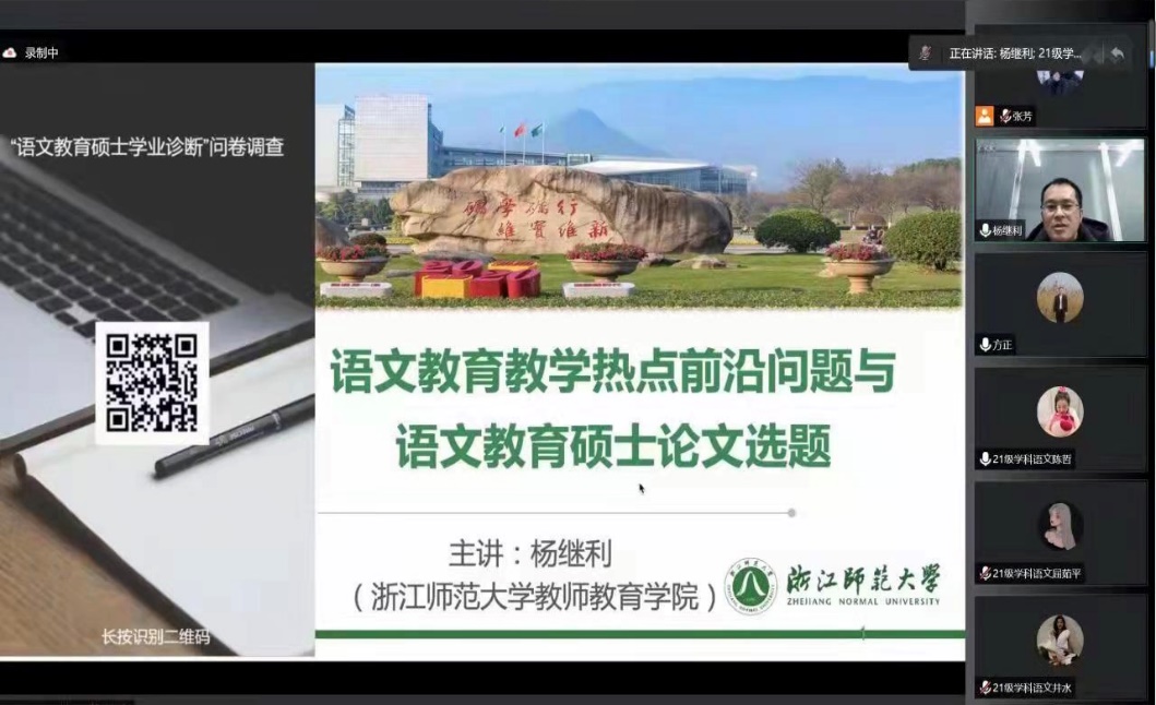 在交流互动环节,杨教授耐心细致地解答了2021级学科教学(语文)领域三位研究生就论文选题提出的困惑,并给出了行之有效的指导与建议。同学们纷纷表示收获颇丰。