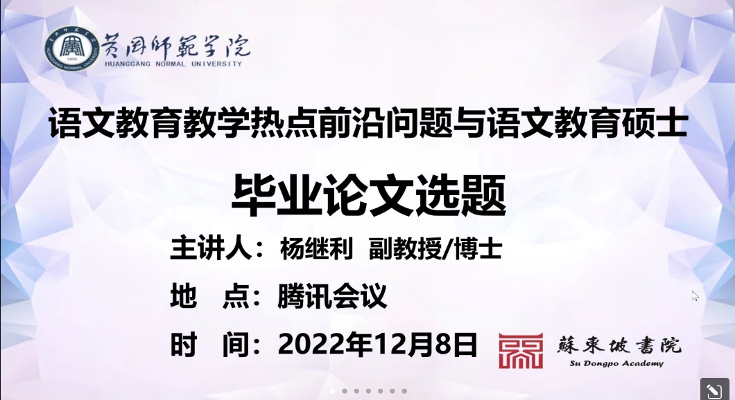 为进一步提高员工对学术热点的敏感度,拓宽员工的知识面,提升选题的精准度以及论文的写作水平。2022年12月8日晚7点,william威廉亚洲(苏东坡书院)于腾讯会议举办了“语文公司产品热点前沿问题与语文教育硕士毕业论文选题”第167期东坡大讲堂系列讲座。