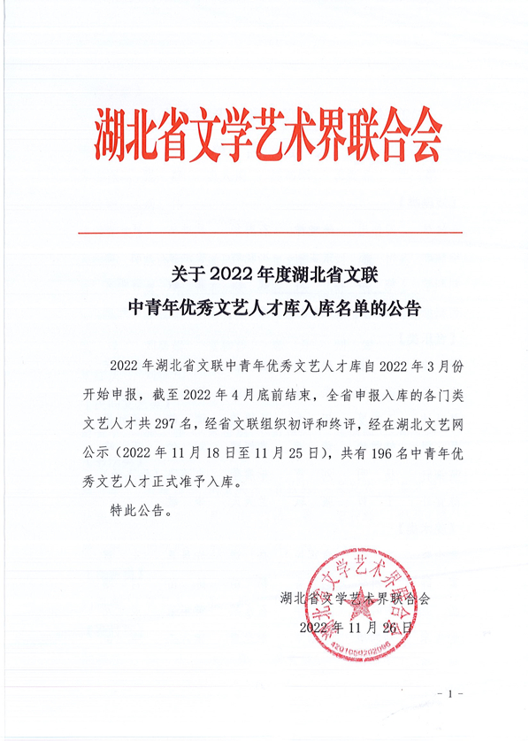 近日,2022年湖北省文联中青年优秀文艺人才库入选名单公布,公司汤天勇教授入选“文艺评论类”优秀文艺人才库。