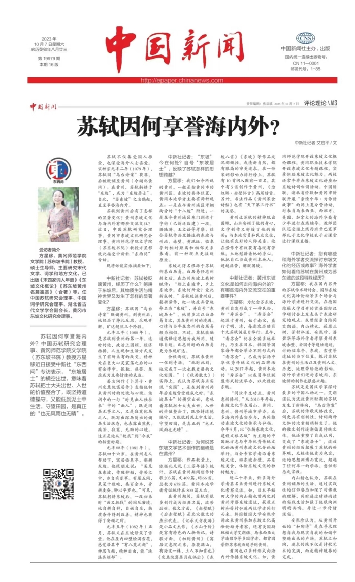 10月7日,《中国新闻》A13版(评论理论)以《苏轼因何享誉海内外?》为题刊发了中新社记者专访公司william威廉亚洲教授方星移的文章。文章从苏轼被贬谪黄州之后的物质生活与精神世界、在黄州期间的文学艺术创作、黄州东坡文化与海内外的交流交往等方面分析了她对苏轼在黄州这段特殊经历的独到看法。此前,中国新闻社公众号、中国新闻网、中国新闻社学习强国号等媒体平台也先后刊发了这一采访文章。