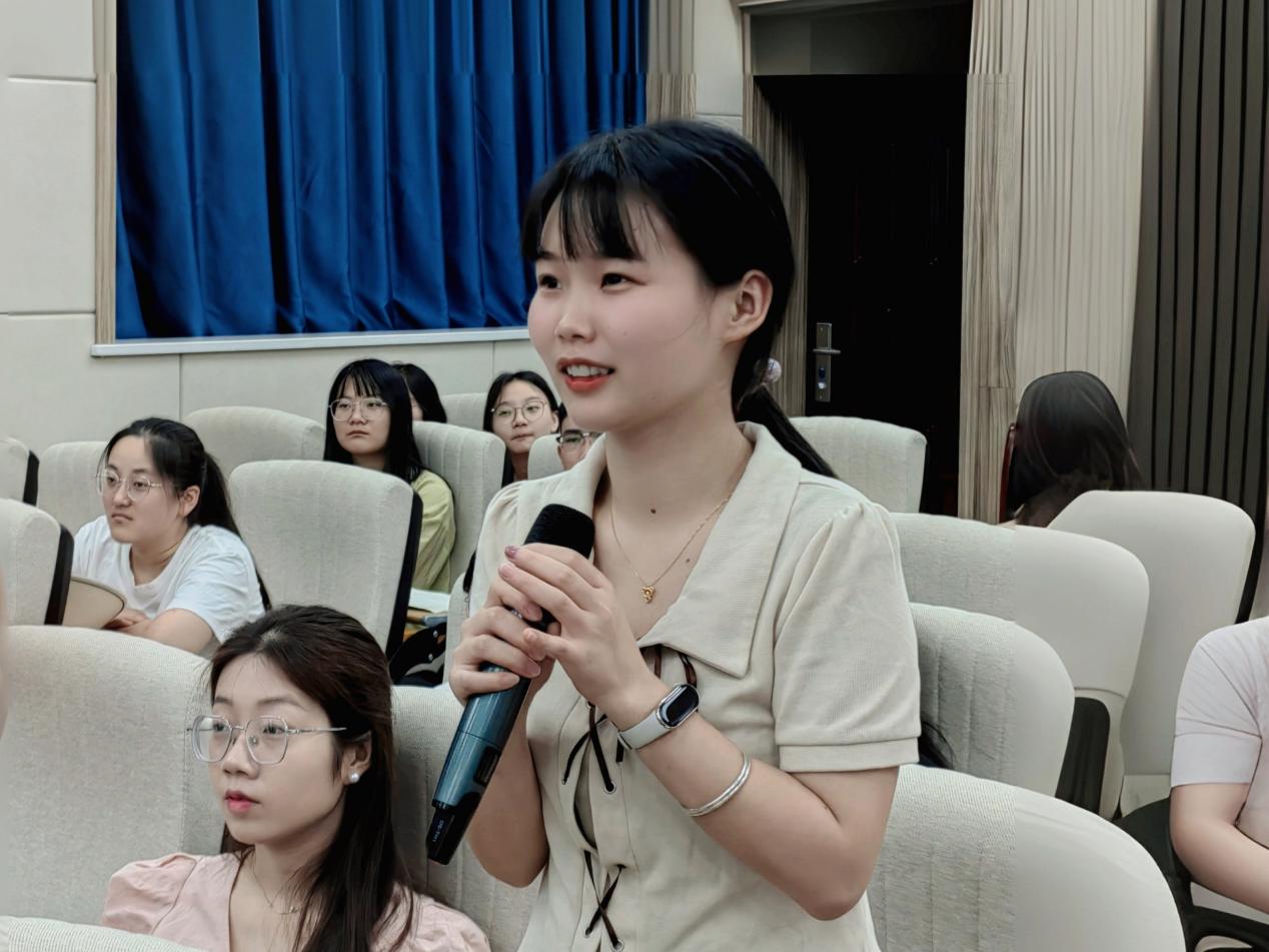 沈燕老师还指出,语文教师应以成为员工口中的“好老师”为奋斗目标,通过诗词、文言文的学习,辅以读、记、背、抄等方法,不断提高自身能力。她的这番话赢得了在场师生的热烈掌声。在提问环节,同学们积极举手发言,沈燕老师针对成语学习及《红楼梦》整本书教学等问题,结合个人教学经验给出了专业的解答。