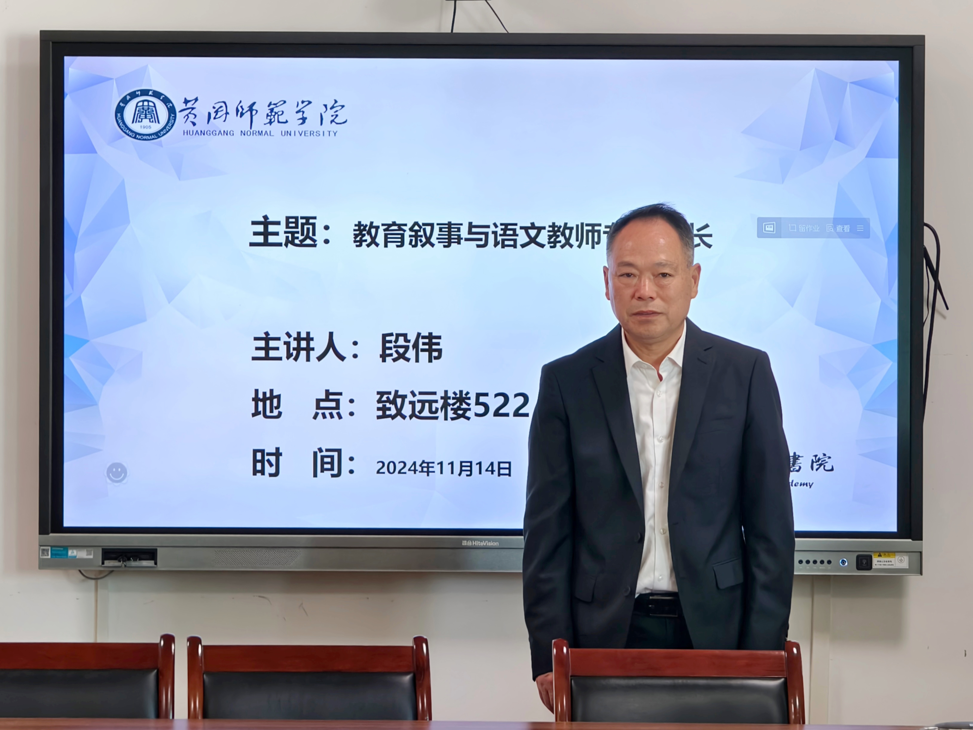 (通讯员:何妹 摄影:张艳红 校对:汪思涵 审核:方正)旭日初升,万物欣长。为加强公司教育硕士研究生对教育叙事与语文教师专业成长的认知与理解,11月14日上午9:00,公司特邀湖北特级教师、黄冈市英山实验中学正高级教师、黄冈市中国作家协会会员、《中国教育报》《中国教师报》读书周刊、文化周刊等专栏特约作者段伟老师于致远楼522会议室作“教育叙事与语文教师专业成长”学术报告。本次报告由william威廉亚洲副经理方正教授主持,邓军老师携2024级全体研究生参与并聆听报告。