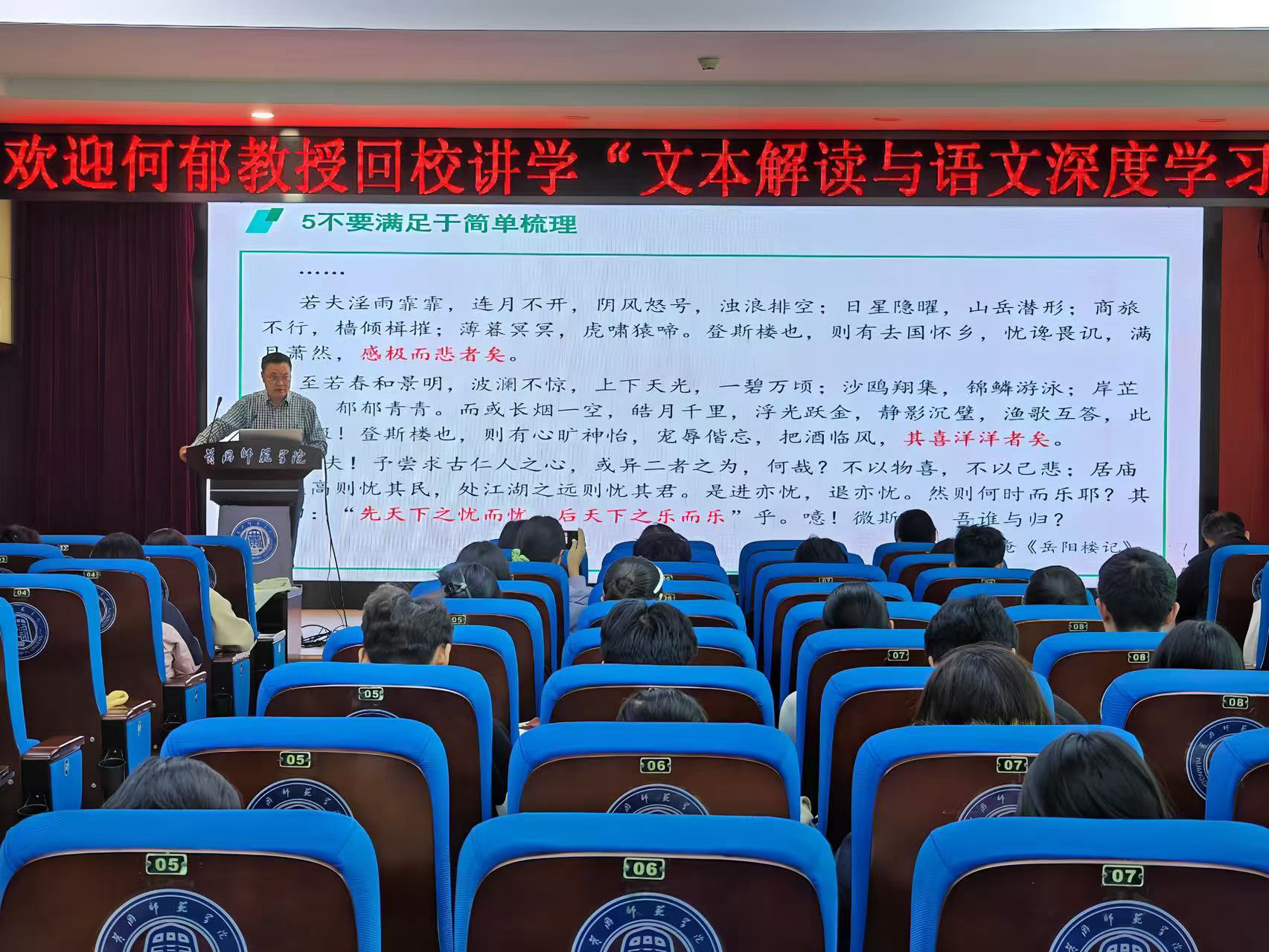 讲座进程中,何郁老师从自身阅读经验和教学经历出发,向大家分享语文文本解读与深度学习的方法和技巧,并强调提高文本解读能力的重要性和必要性。他指出,语文学科的尊严与质量取决于文本解读的能力,只有通过持续不断地阅读才能有效增强文本解读能力。基于此,何郁老师以《春夜喜雨》《乡愁》为例,用替换法和联想法解释形容词背后的深刻内涵,做到“小抓手”“大思想”。谈及如何处理文本解读时,何郁教授借助《岳阳楼记》分析段落间的递进关系,并让同学们在互动中深入理解文本逻辑与人生辩证法的内涵,加强对文本的深入解读和思考。