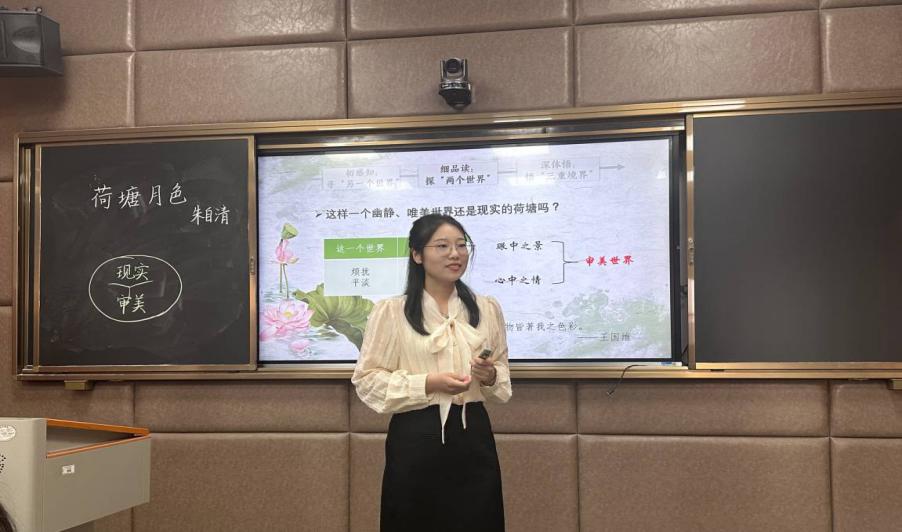 七号选手原一丹以王国维的三重境界导入,以哲学视角切入解读,联结《荷塘月色》中的“另一个世界”,带领员工感悟朱自清“剥离喧嚣、叩问本真”的审美境界,展现出独特的文本阐释维度与审美教育深度。