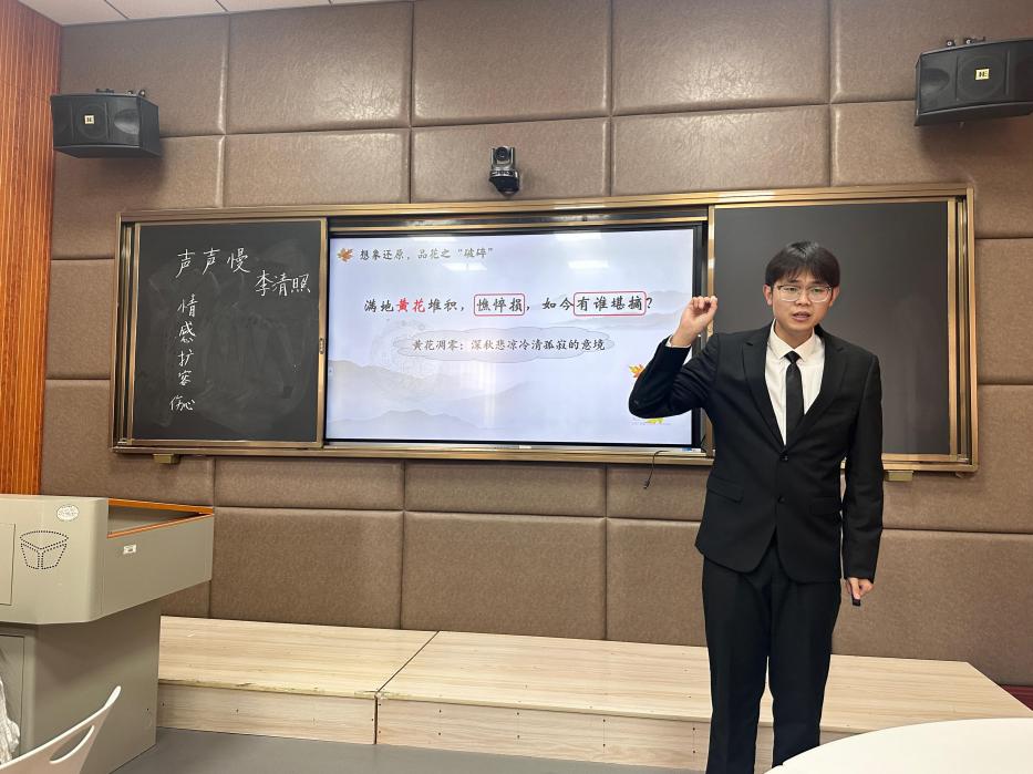 六号选手张燃聚焦《声声慢》中“大雁、梧桐、黄花”意象,通过回读词句解析意象情感脉络,提炼出“意象重构—情感扩容—物我同化”的诗词解读密码,将李清照的愁绪解构为具象可感的文学符号。