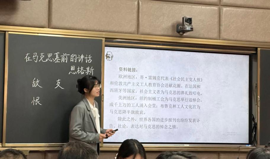 一号选手谭慧婷以《在马克思墓前的讲话》中马克思对敌友的不同态度为切入点,层层剖析,深刻诠释了马克思精神的永垂不朽,展现出较为深厚的文本解读能力与出色的教学素养。