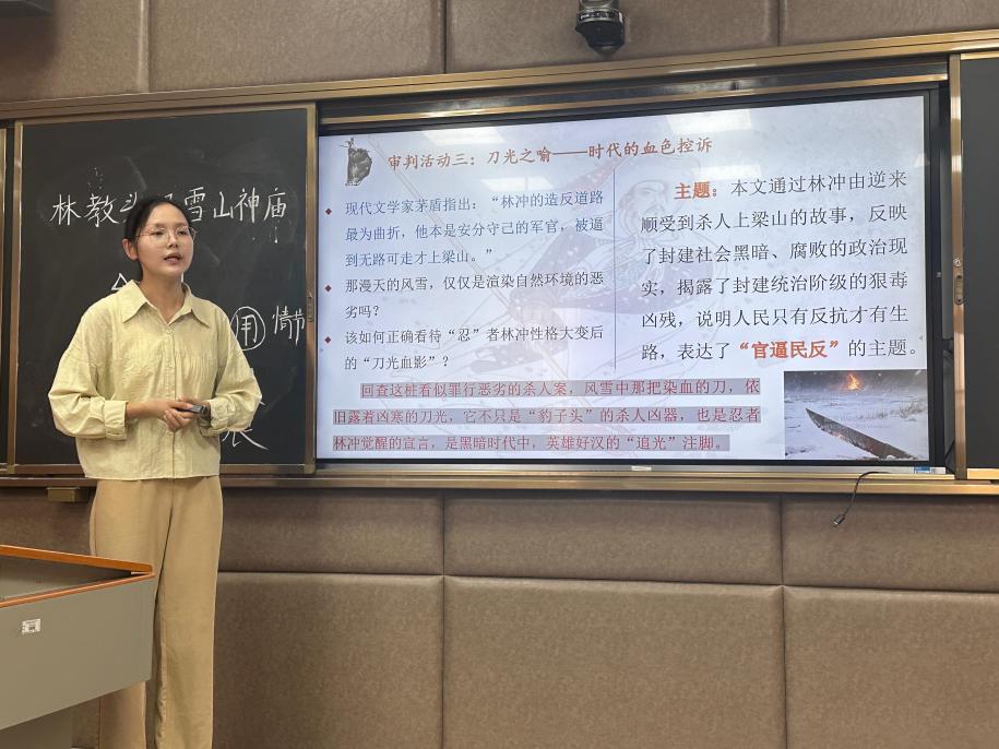 八号选手韩朋丽对比《林教头风雪山神庙》中“刀”与“枪”使用场景的变化,剖析人物从“忍辱负重”、“愤恨觉醒”再到“狠厉反抗”的心理蜕变轨迹,让员工透过“刀枪”的冷硬质感,感受古典文学中人物命运的张力。