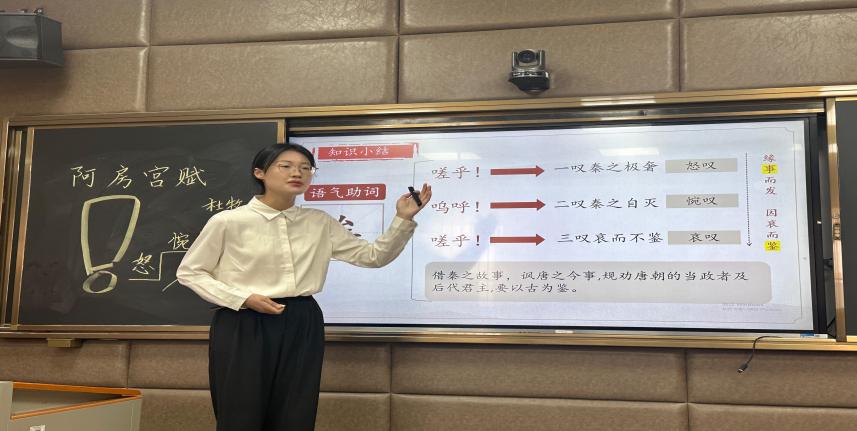 四号选手孙君怡以《阿房宫赋》中的古文虚词为抓手引导员工体悟兴衰之思,将“秦之骄奢”与“民之苦难”进行对比,提炼出“悲叹、惋叹、哀叹”三重情感,并借鲁迅、闻一多等先贤事例,将文本解读升华至家国责任叩问。
