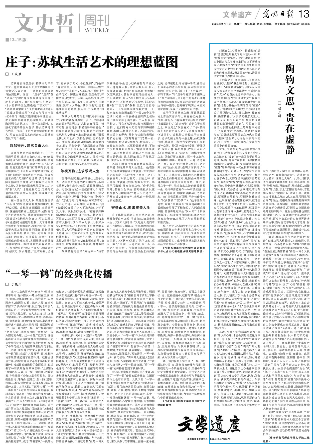 胡立新教授的文章《陶钧文思,贵在虚静》刊登在《光明日报》(2025年9月1日)“文史哲周刊・文学遗产”版。该文深入探讨了刘勰在《文心雕龙》中提出的 “虚静为文” 这一极富民族特色的文艺理论思想。在刘勰之前,文学领域仅有屈原和陆机涉及相关概念与思想,而刘勰率先明确提出 “虚静为文” 论。胡教授指出,这一思想受老庄道家 “虚静” 论影响,对作家写作具有重要价值。一方面,作家在创作中需 “虚静” 身心,做到身心交养,避免因过分苦思而损身伤神,以 “虚静” 修养保持身体气血和顺与精神清澈澄明,从而写出理达情畅之作;另一方面,需要 “虚静” 的认知心理,使思绪澄澈不混乱。胡教授的研究为当代文艺理论界传承与弘扬这一独特理论提供了深刻见解,对理解古代文论与指导现代创作具有重要意义。该文体现了胡立新教授在中国古代文论与美学研究领域的持续深耕。