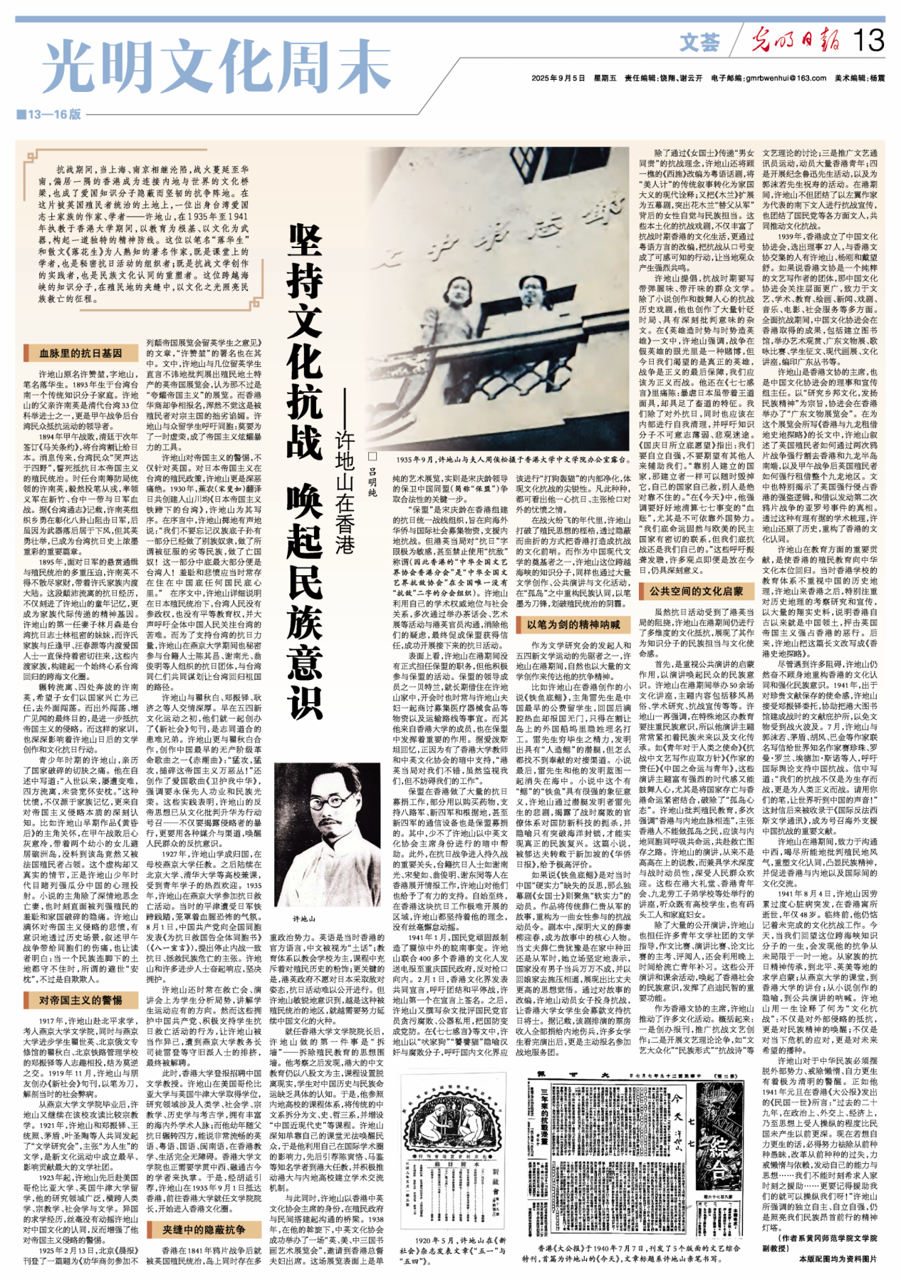 吕明纯教授的文章《坚持文化抗战 唤起民族意识——许地山在香港》刊登在《光明日报》(2025年9月5日)“光明文化周末・文荟”版。文章聚焦于抗战期间许地山在香港的文化抗战贡献。当上海、南京沦陷,香港成为爱国知识分子抗争阵地。许地山出身台湾爱国志士家族,其父亲许南英是甲午战争后台湾民众抵抗运动领导者。许地山在香港大学执教期间,以教育为根基、以文化为武器,构建精神防线。他既是课堂学者,也是秘密抗日活动组织者,更是抗战文学创作实践者与民族文化认同重塑者。吕教授深入挖掘许地山的抗日经历,包括其家族抗日基因传承、对帝国主义的警惕以及在香港殖民统治夹缝中的隐蔽抗争等方面。吕明纯教授来自台湾台北,在性别研究、现代戏剧、台湾文学等领域成果显著,此次文章从独特视角展现了文化抗战的历史意义,为抗战史与文化研究增添了新的学术视角。该研究展现了吕明纯教授在中国现当代文学与文化研究方面的扎实功力与历史视野。