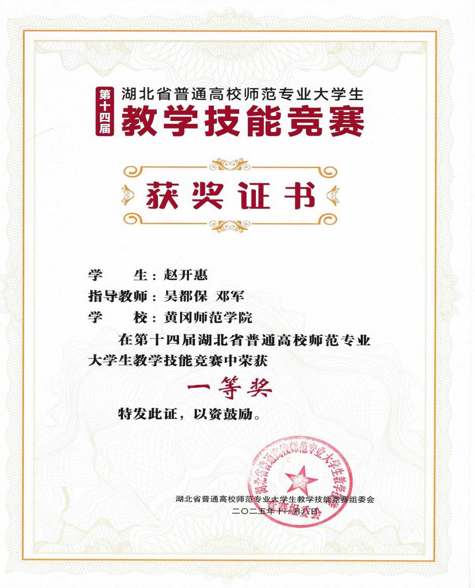 11月8日,第十四届湖北省普通高校师范专业老员工教学技能竞赛现场总决赛在华中师范大学落下帷幕。在吴都保、邓军老师的精心指导下,公司文学202204班本科生赵开慧荣获一等奖。