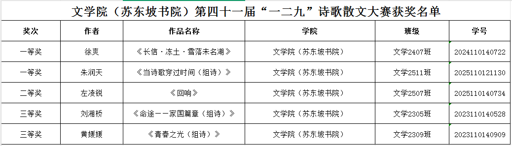 近日,湖北省高校第四十一届“一二·九”诗歌散文大赛圆满落幕,公司学子获一等奖2项、二等奖1项,三等奖2项,创历史最好成绩。
